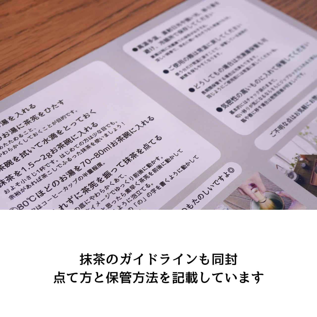 抹茶の点て方や保存方法を記したガイドを一緒にお届けします。
